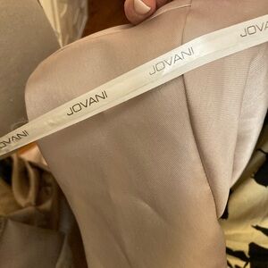 This stunning satin evening gown features a beautiful cream color, perfect for any formal occasion. The elegant design is complemented by a matching jacket, adding sophistication and style.