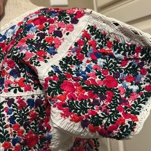 Vintage Mexican white tunic with colorful floral embroidery. Features striking red, pink, and blue designs. Size is between a small and medium