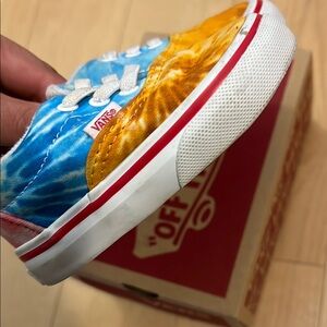 Brighten up your child's wardrobe with these vibrant Vans tie-dye sneakers. Featuring a fun mix of blue and orange, these shoes are perfect for playful days.