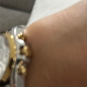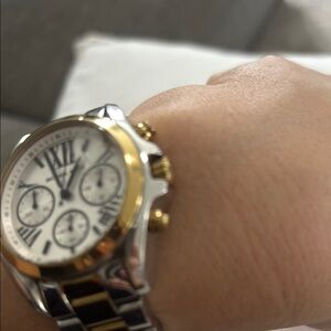 Stylish Michael Kors watch with a two-tone design. Features a white dial with Roman numerals and chronograph functions. Perfect for any occasion.