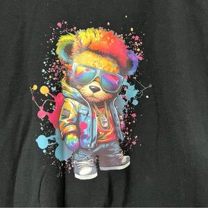 Let your kid show off their bold style with this vibrant black graphic tee! Featuring a colorful bear in sunglasses, sneakers, and a street-style hoodie, this tee is perfect for trendsetters who love playful and artistic looks. The shirt is a Youth Large (14/16) from Gildan, made of 100% cotton for comfort.