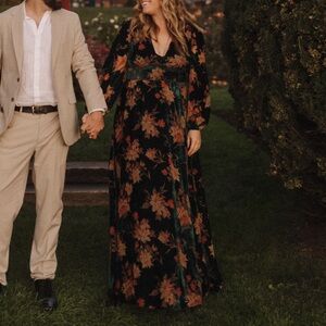 Baltic Born Lynlee Metallic Floral Dress. Size Large. Smocked stretchy center. would be great for maternity as well. I wore it to a fall wedding and it was perfect for dancing/sitting and in general being comfy. I’m 5’4”. I wore heels, you can see the length for that in the first image.