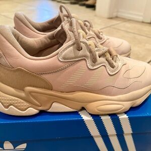 Adidas Ozweego Ozwg Originals Women’s size retro 90s style chunky sneakers in a beige and light pink/ivory shade. The laces are elastic and do not require any tying so they are quick to put on and take off. Perfect for athletic or casual wear. Sneakers are lightly used but in great condition.