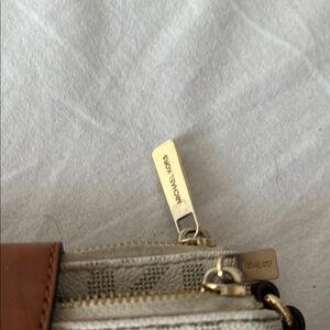This elegant Michael Kors crossbody bag features a striking white and brown color scheme, adorned with a signature monogram pattern. The rich brown leather accents and gold-toned zipper closure enhance its sophisticated design, making it a perfect accessory for any occasion.