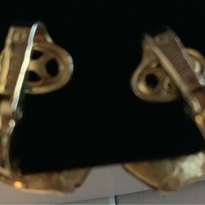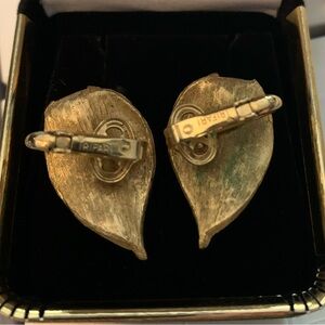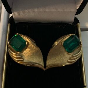 Large emerald green crystal in a gold tone setting. These clip earrings measure 1” x 3/4” and are signed Trifari. Slight verdigris patina on back of one of the earrings- should be cleanable but I did not try. Since that is on the back it won’t even be noticed, but I priced these based on condition. The green stones are flawless so overall condition is good!