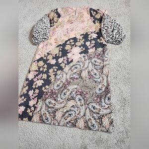 im not sure the sz but you can see the measurements .The Anthropologie X Kachel Evangeline Puff Sleeve Patchwork Midi Dress in size X is a colorful and happy dress with a floral pattern and puff sleeves, perfect for various occasions like weddings, parties, and casual wear. Made of 100% cotton, this lightweight dress features a round neck, button closure, and a A-line silhouette. It is suitable for all seasons and can be machine washed for easy care. The multicolor design and bohemian theme make it a versatile and stylish choice for women looking for a unique and fashionable outfit.