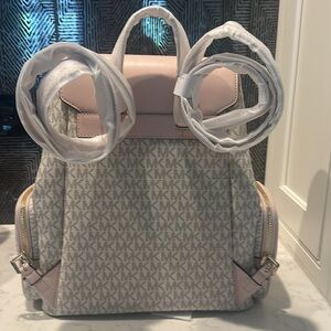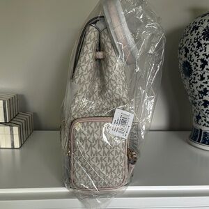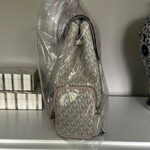 Stylish Michael Kors backpack in pink and gray. Features signature MK pattern. Never used, or taken out of bag it came in. Was given as a gift.