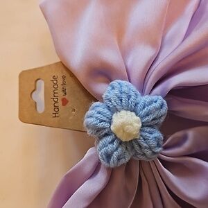 Keep your hairstyle looking fresh and perfectly in place all day long with this lavader purple Satin bow. Handcrafted Bow barrette hair clip. Take your look from basic to Bohemian style, and the hand knit crochet blue & white puffy flower detail in the center of the satin bow is on trend