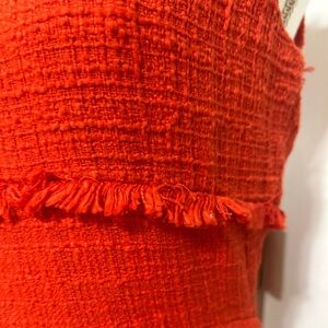 This elegant red sleeveless dress is perfect for any occasion. Its vibrant color and stylish design make it a must-have in your wardrobe. Tweed texture with fringe trim details. In great condition, this dress is so flattering!