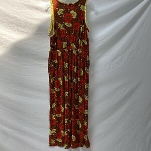 Stylish jumpsuit with a vibrant floral pattern. Features red and green colors.