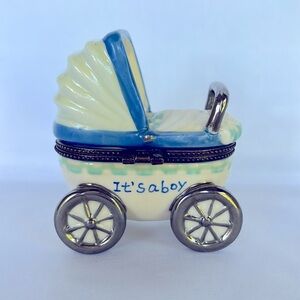 Adorable IT’S A BOY Porcelain Hand Painted Blue Cream Baby Carriage Trinket Box