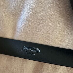 Stylish black belt featuring a bold gold Moschino logo. Perfect for adding a designer touch to any outfit. Used once or twice. Size 42.