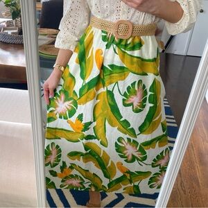 ➖ Embrace vibrant style with this tropical print maxi skirt. Featuring lush green and yellow hues, it's perfect for a sunny day out. Pair it with your favorite top for a chic look. With pockets! Waist has stretch ➖