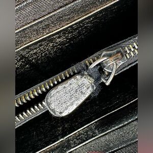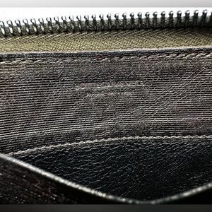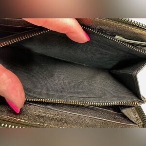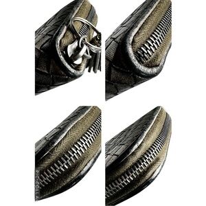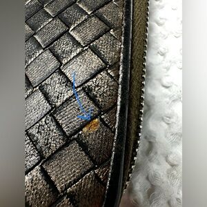 Woven leather zip-around wallet, metallic bronze color with fading and wear that gives it a cool distressed look. Zipper pull came off at some point, I added a tassel to make it easy to use which can be replaced. Overall good used condition-signs of normal use and wear throughout including edge wear, corner wear, fading to exterior leather. Interior is in good condition with cash pockets and card slots. Interior zipper pull has a lot of wear.