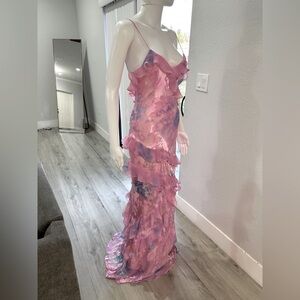 Elegant pink maxi dress with floral patterns. Features ruffled layers and thin spaghetti straps. This dress is definitely going to turn heads. Itโs So Ethereal and Stunning!!! ๐