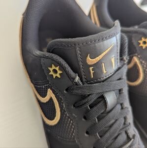 This one's for my sneaker heads. Women's Nike Air Force 1 Low Legendary (Women's) black and gold sneakers. Features the iconic Nike swoosh and Air branding with gold details and accents. These belong in your collection!