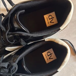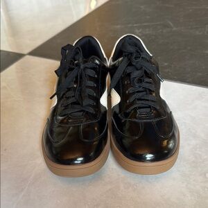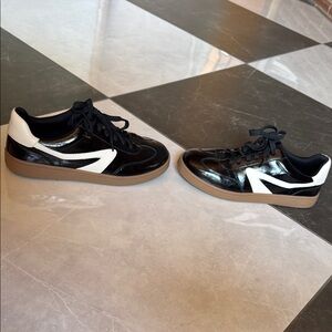 Stylish black and white sneakers featuring a gum sole. Perfect for casual wear.