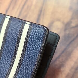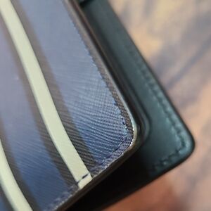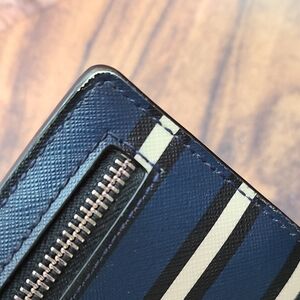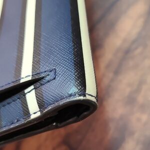 Stylish Kate Spade wallet with blue and white stripes. This wallet appears to be brand new with some rubbing on corners shown in photos.