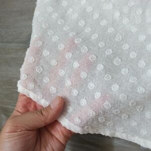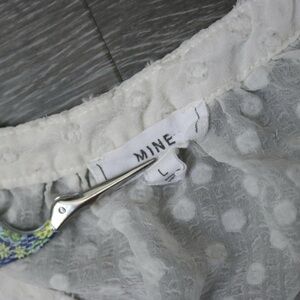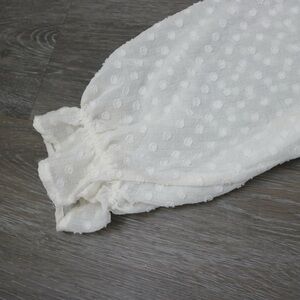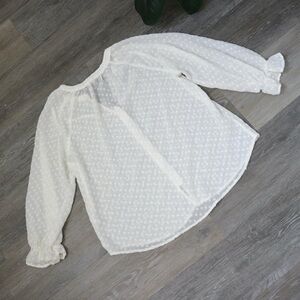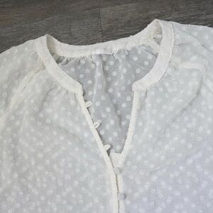 White sheer swiss dot peasant blouse. Has buttons all the way to the bottom and long sleeves with an elastic scrunch at the bottom. Brand is MINE and marked a size large in women's. 100% polyester material. Buttons can be undone to worn undone if you want as well.