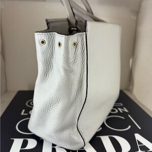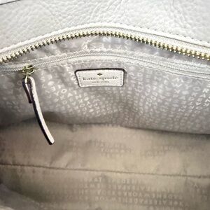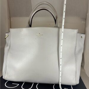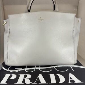 This sophisticated white tote by Kate Spade showcases a structured trapezoid design, crafted from textured leather for a refined appearance. The gold-toned hardware enhances its elegance, making it a versatile accessory for any occasion. GUC. See pics for marks