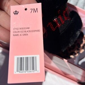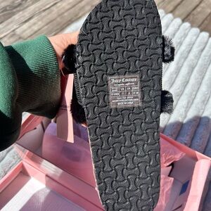 Stylish Juicy Couture slides with leopard print and black fur. Red rhinestone logo adds a chic touch. Soooooo soft and comfy! You or your loved one needs a pair. Fur real