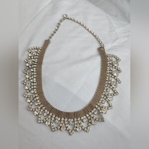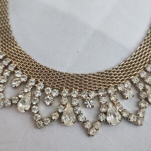 Beautiful vintage gold tone mesh necklace adorned with round and teardrop shaped grey rhinestones. Measures 16 inches, classic J hook .