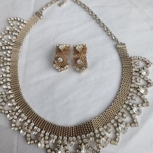 Hobe?? Vintage Mesh And Rhinestone Choker Necklace & Matching Ear Clips Unsigned