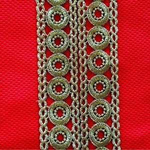 3.25" wide gold lace trim runs down front center.