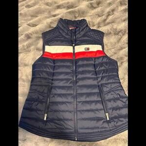 Stay stylish and warm with this Tommy Hilfiger Sport puffer vest in navy blue. Features classic red and white stripe accents with a quilted design. Perfect for layering during chilly weather or outdoor activities. Lightweight, comfortable, and in excellent condition. Size XL.