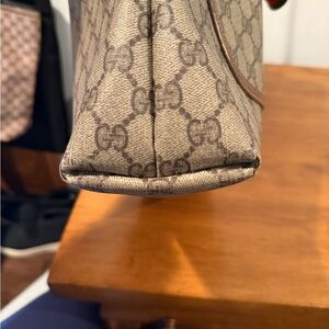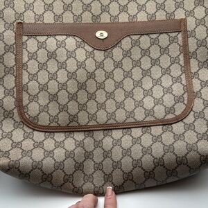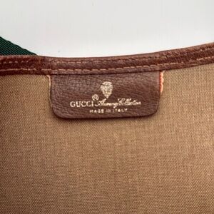 Authentic Vintage Gucci GG monogram tote bag. This designer bag has a pocket outside (no pockets inside), leather trim and details. It can be carried on the shoulder with the signature red and green web straps. The bag crafted from coated canvas, which makes it very sturdy and water-resistant. A classic bag for all your needs! Add new items to your wardrobe and combine your outfit with one our accessories for a finishing touch.