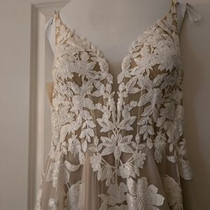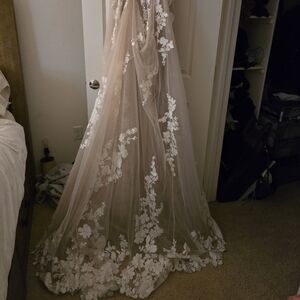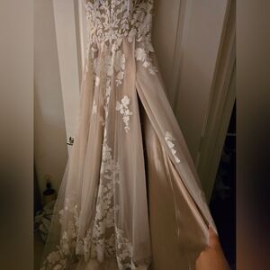 Elegant wedding dress with floral lace overlay. Sleeveless design with a flowing skirt. Perfect for a romantic ceremony.