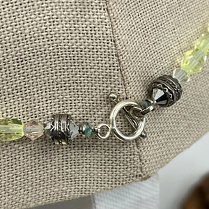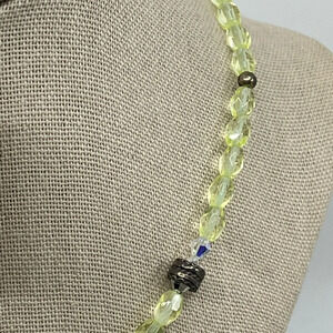 This beautiful vintage necklace features a sterling silver sun pendant stamped 925 and a stunning arrangement of greenish-yellow faceted beads or crystals. The beads add a radiant sparkle to the design, and their exact material (crystal or glass) cannot be confirmed but contributes to the necklace's unique charm.