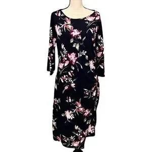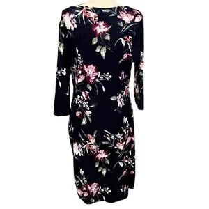 Navy dress with flowers.