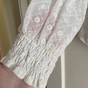 Delicate eyelet and well-placed ruffles lend this flattering blouse an endlessly feminine finish that elevates everything. Semi-sheer polyester