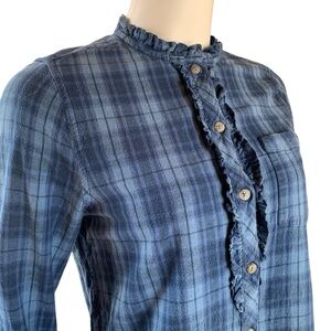 Features swirling abstract all over pattern in blues and white, shires yoke and branded gold tone buttons.