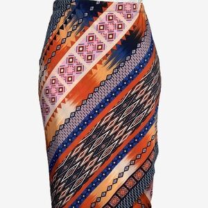 This striking midi pencil skirt by VENUS features a bold asymmetrical design in vibrant orange and red hues. Perfect for cocktail parties or a night out, its smooth fabric and dynamic diagonal lines create a modern, standout look.