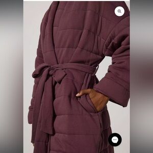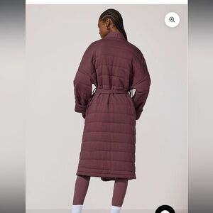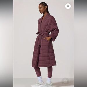 Stay cozy in this elegant quilted wrap studio coat. Perfect for keeping warm and stylish on trips to and from Pilates or yoga. The rich plum color adds a touch of luxury.