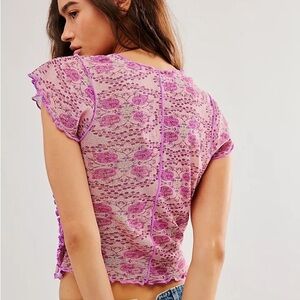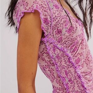 This vibrant crop blouse from Free People features a stunning pink and purple palette with puff sleeves and a ruched, fitted design. The intricate floral pattern adds a touch of elegance, making it a standout piece for any occasion. NWT.