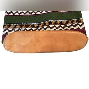 Beautiful colors on this thin bucket bag with crossbody strap. One main open compartment with zip closure. Trim and handle are leather. In great condition.