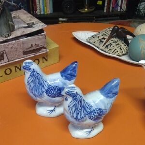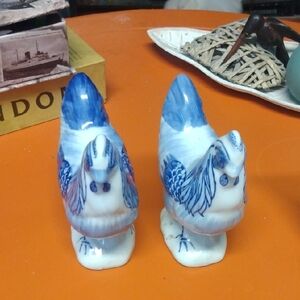 Charming ceramic chicken figurines in blue and white. Perfect for home decor or collection.