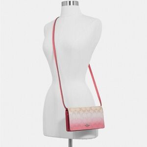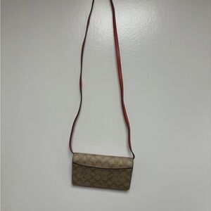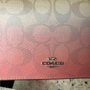 Super cute Coach signature crossbody bag with detachable straps so it can be used as a clutch. I absolutely love the coral and tan ombré on this! Really great condition overall with the only notable issue being a scuff or ink mark at the very top (see photos).