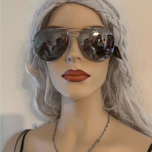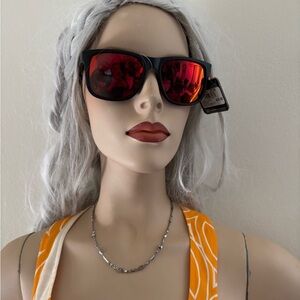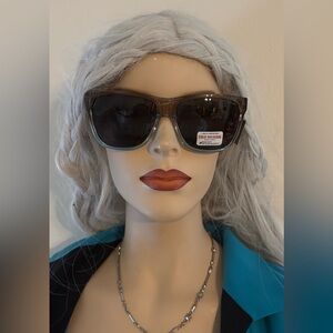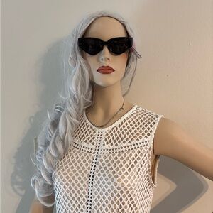 These oversized black sunglasses feature a classic cat-eye shape with dark tinted lenses, offering a fashionable and modern style. Perfect for adding a touch of elegance to any outfit. Has a small pink heart on the tip of the sunglass frame. Interior of sunglasses has a fun pink/blue hue with flecks of sparkles.