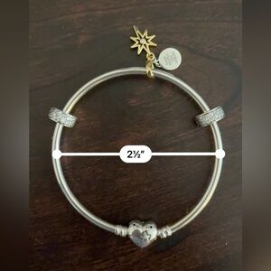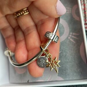 Elegant Pandora bracelet featuring a silver band with a gold charm. Perfect for adding a touch of sophistication to any outfit.