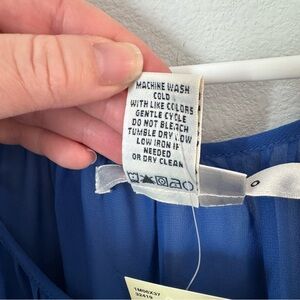NWT Max Studio cobalt blue blouse, size XS. Polyester blouse features tiers of fabric, three-quarter-length sheer sleeves, and a tank-top style lining.