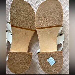 These white leather sandals feature an adjustable ankle strap with a gold-tone buckle. The design includes multiple straps across the foot, secured w/ gold-tone rivets. The sandals have a light-colored wooden platform sole & heel. The soles are clean, showing no signs of wear. The insole is black w/ the brand name printed in white. No box.