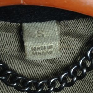 Men’s Burberry Brit wool coat in a charcoal gray with spread collar. Dual welt pockets at chest and dual flap pockets at side. Classic check lining on the inside and button closure front. Please note inside lining is damaged around the bottom edge of the jacket, outside is in good condition with some minor piling. Approx Measurements: sleeve 34”, length 27”, Chest 36”, shoulder 15”.