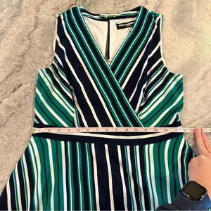This dress has bold stripes in navy blue, green and white, A-line silhouette Surplice v-neckline Sleeveless Waist seam Side seam pockets Multi stripe print Fully lined Midi length with zip back closure. Excellent pre owned condition