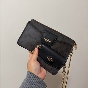 Comes with shoulder and crossbody strap.