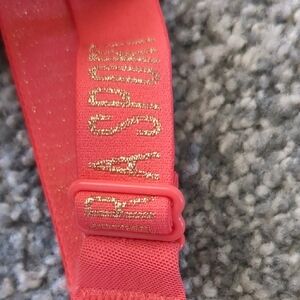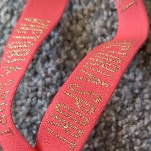 Stylish pink sports bra featuring gold lettering. Perfect for workouts.