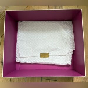 Bag includes gift box with purple interior and white Coach tissue paper.
